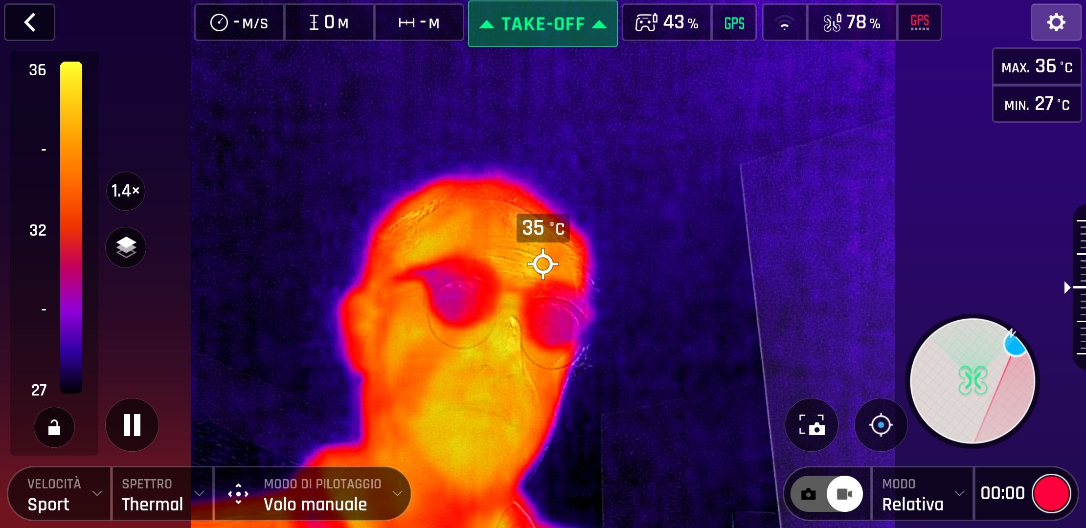 Ora che c’è luce, Anafi Thermal fonde i flussi video che vengono da entrambe le camere, quella ottica che può arrivare a 4k e quella termica che deve accontentarsi di 160×120 pixel, che tutto sommato non sono pochi per una termocamera.