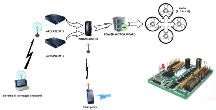ArduCluster che come suggerito dal nome proviene direttamente dal mondo Open Source di Arduino progettata e realizzata in Italia, si inserisce tra il flight controller e i regolatori di potenza dei motori (ESC) del drone.