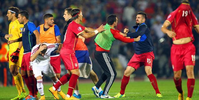Il calciatore serbo Stefan Mitrovic riesce a prendere le la bandiera, ma su di lui si avventano due giocatori albanesi ingaggiando una colluttazione che coinvolge anche i tifosi che invadono il campo. Agli arbitri non rimane altro che sospendere la partita.
