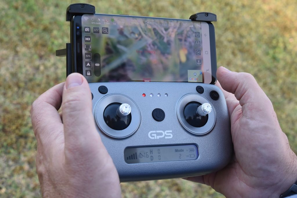 Da notare che oltre ai led presenti nella parte superiore del controller che forniscono qualche indicazione sullo stato di carica delle batteria e sulla connessione con il drone, possiede anche un display LCD nella parte inferiore che mostra, quanti satelliti sono stati acquisti dal drone, in che modalità di volo si trovi, lo stato di carica delle batterie del drone e del radiocomando, la distanza e l’altezza del drone nonché l’intensità del segnale ricevuto.