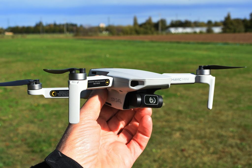 DJI Mavic Mini tenuto in mano, peso di soli 249 grammi
