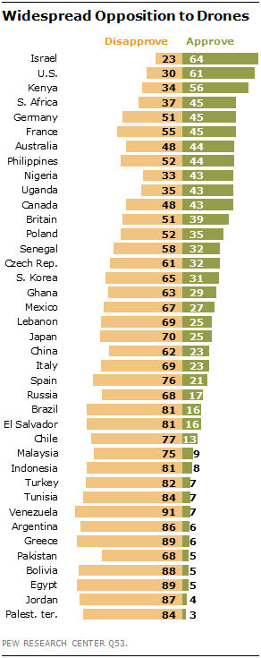 Israele in particolare è il Paese al mondo dove i droni ottengono più consensi, due cittadini su tre li approvano, mentre per contro i Territori palestinesi sono i paese che li aborre di più, convincono solo il 3% degli abitanti. Persino meno del Pakistan, dove i droni sulla testa qualcuno se li è presi, ma la percentuale di favorevoli pur restando minima è comunque doppia rispetto alla palestina, 5% del campione. In Europa sono possibilisti tedeschi e francesi, la percentuale di chi approva è del 45%, in Italia crolla al 23% e al 21% in Spagna.